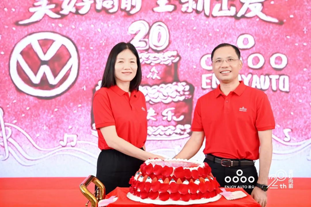 在緩緩奏起的生日祝福樂曲聲中,一汽-大眾華南區(qū)總經(jīng)理竇繪娟與盈眾控股集團(tuán)董事長張桂陽一起切下生日蛋糕,與現(xiàn)場(chǎng)嘉賓共祝盈眾20歲生日快樂,祝福盈眾與一汽-大眾繼續(xù)譜寫新的篇章、創(chuàng)造新的輝煌。
