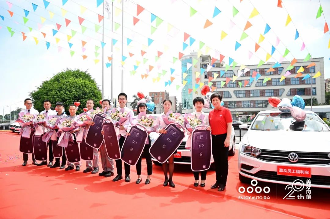 盈眾周年慶期間推出百余輛車的員工購車福利。盈眾控股集團(tuán)黨委書記鄭藝紅現(xiàn)場(chǎng)為十位員工代表交付員工福利車。