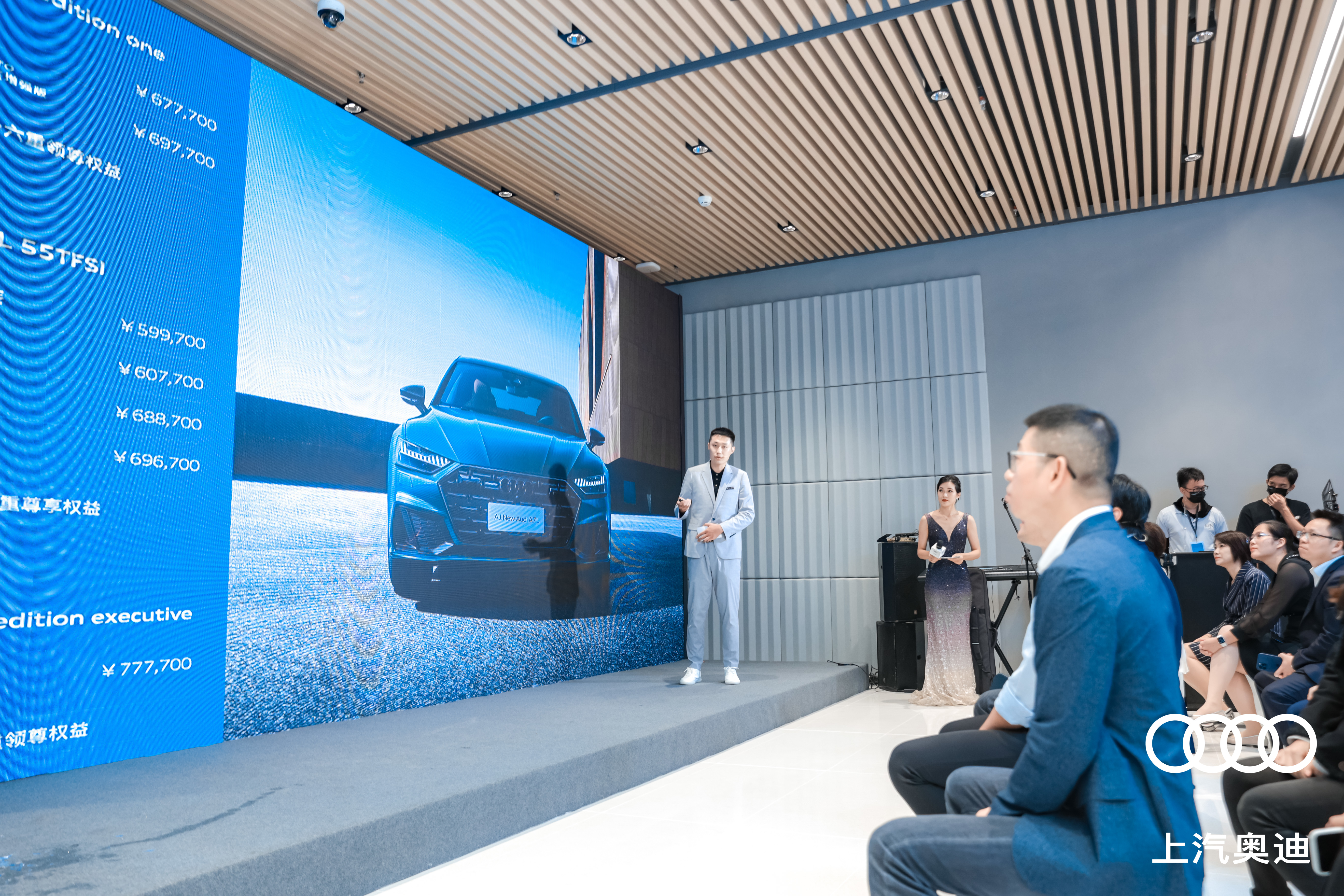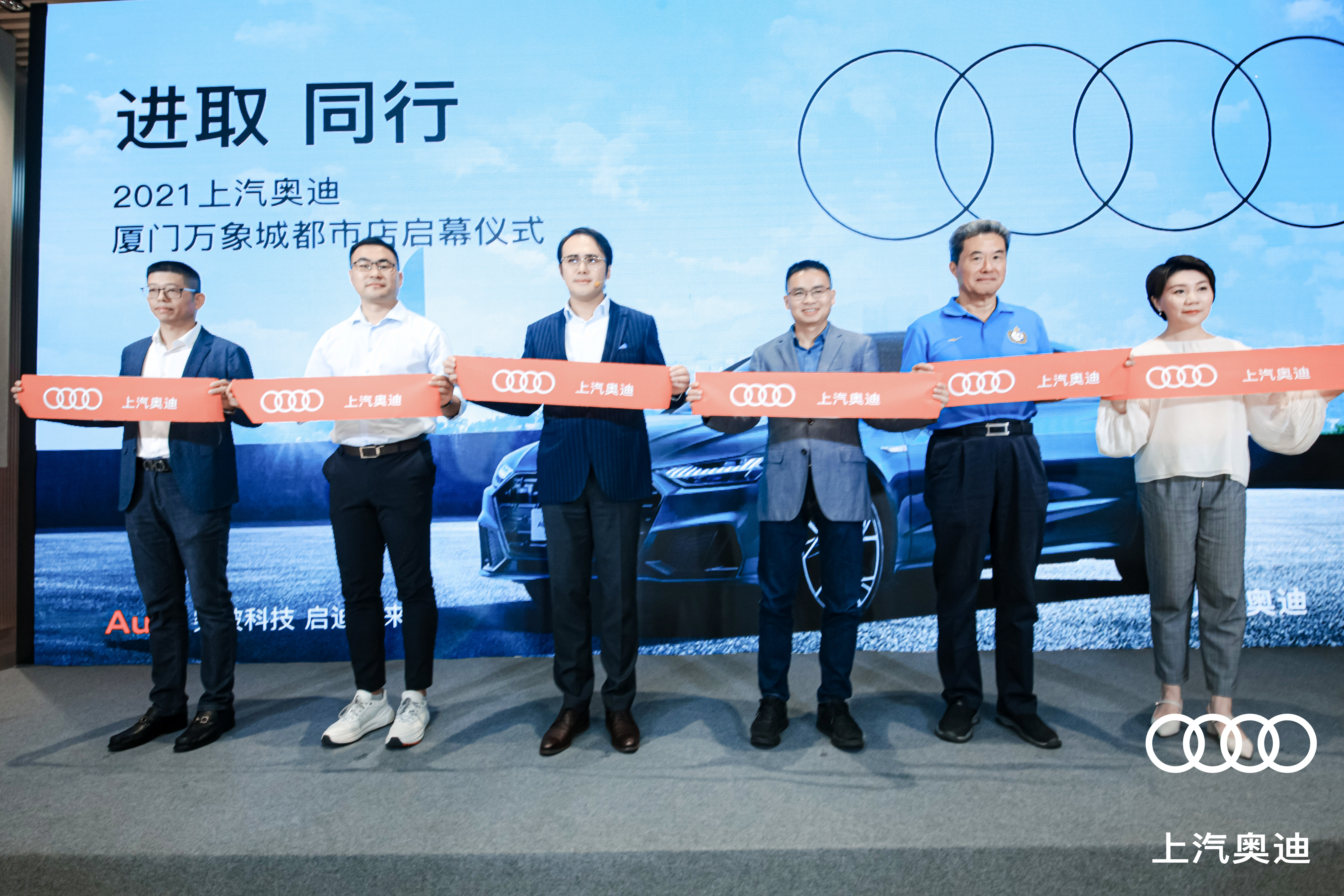 上汽奧迪客戶營銷與數(shù)字化高級總監(jiān)陳歷、品牌渠道營銷高級經(jīng)理?xiàng)顣澡?,廈門市汽車流通協(xié)會會長丁志強(qiáng),萬象城商業(yè)總經(jīng)理井橋,以及盈眾控股集團(tuán)副董事長孫聘仁、副總裁陳偉敏共同上臺為上汽奧迪廈門萬象城都市店開業(yè)剪彩,將現(xiàn)場氛圍推向高潮。