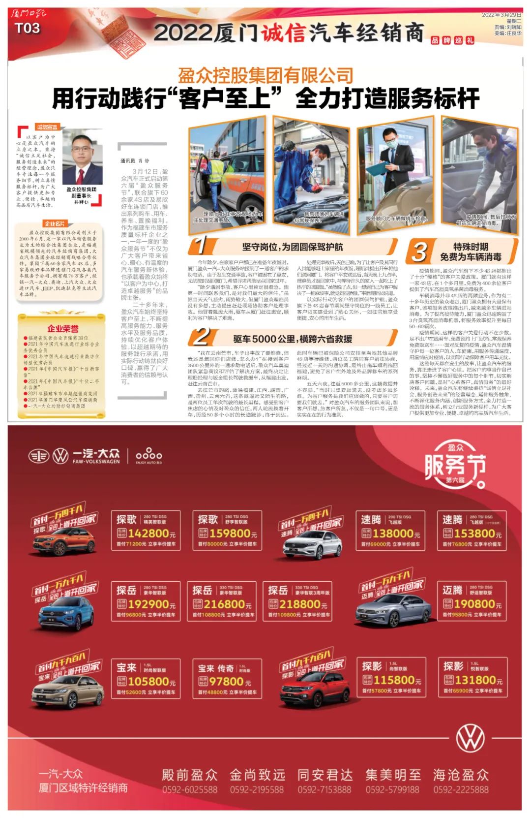 3月12日,盈眾汽車正式啟動(dòng)第六屆“盈眾服務(wù)節(jié)”,聯(lián)合旗下60余家4S店及易欣好車連鎖門店,推出系列購車、用車、養(yǎng)車、置換福利。作為福建車市服務(wù)質(zhì)量標(biāo)桿企業(yè)之一,一年一度的“盈眾服務(wù)節(jié)”不僅為廣大客戶帶來省心、暖心、有溫度的汽車服務(wù)新體驗(yàn),也承載著盈眾始終“以客戶為中心,打造卓越服務(wù)”的品牌主張。
