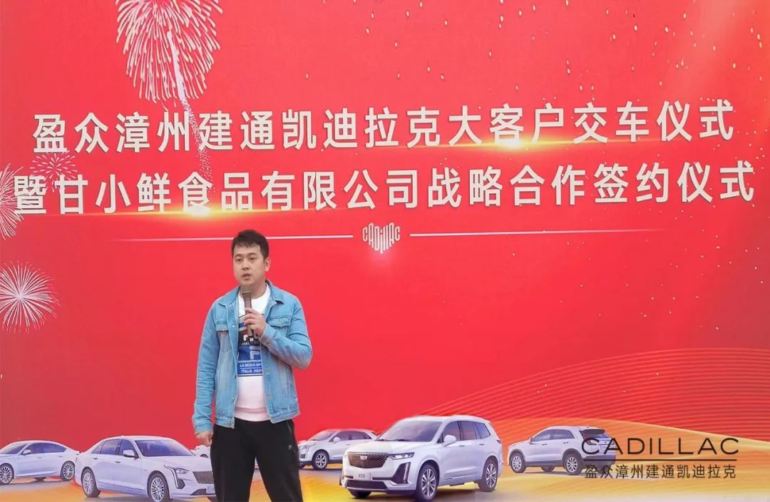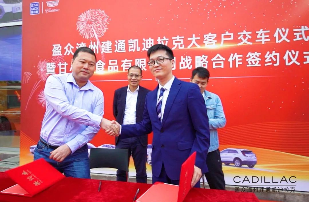 在到場(chǎng)人士的共同見證下,盈眾漳州建通凱迪拉克總經(jīng)理曾蛟龍與甘小鮮(福建)食品有限公司總經(jīng)理??徍炇鹆藨?zhàn)略合作協(xié)議,并現(xiàn)場(chǎng)完成首批八臺(tái)凱迪拉克交車儀式。