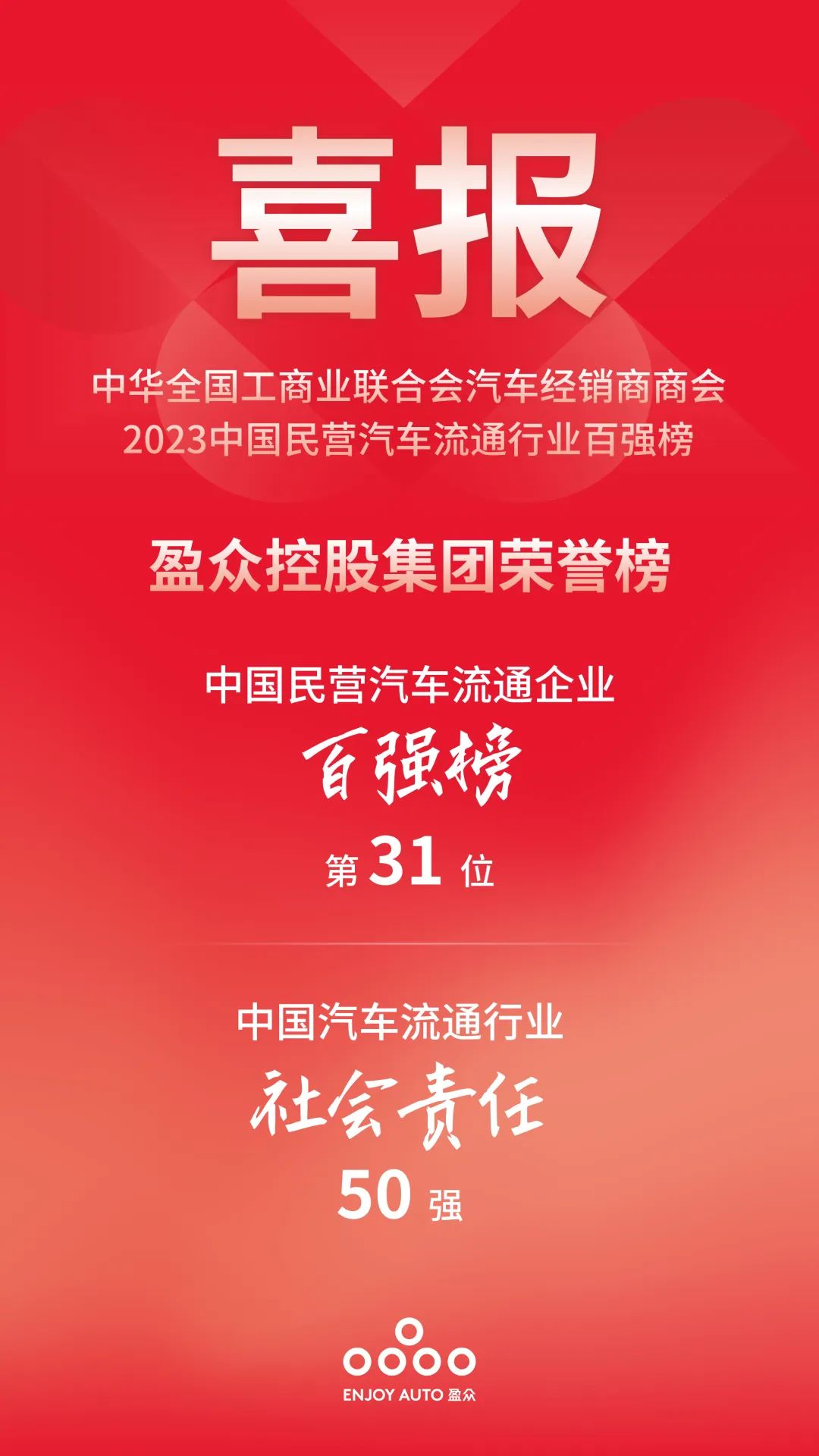 盈眾控股集團(tuán)成功入選“中國(guó)民營(yíng)汽車(chē)流通企業(yè)百?gòu)?qiáng)榜”,位列第31位。