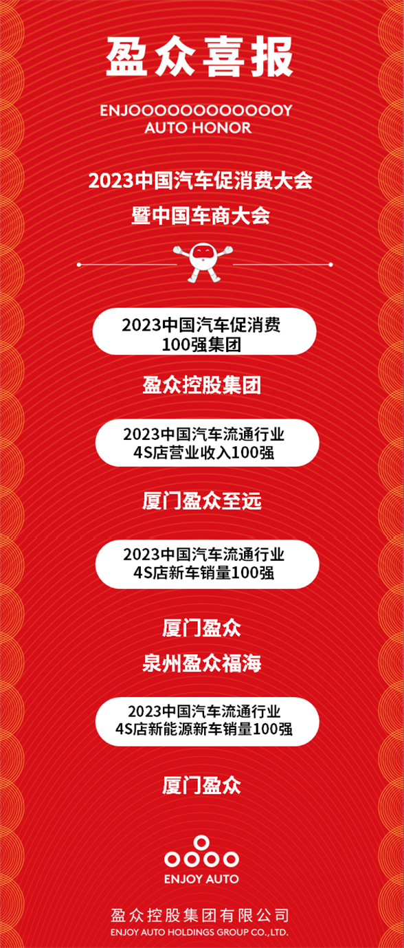 喜報(bào) | 盈眾榮獲“2023中國(guó)汽車促消費(fèi)100強(qiáng)集團(tuán)”及多項(xiàng)榮譽(yù)