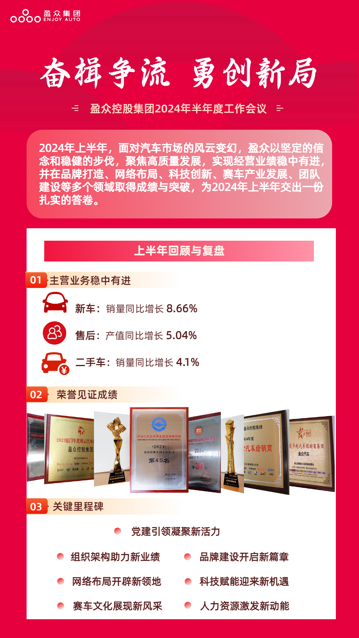 2024年上半年,面對汽車市場的風云變幻,盈眾以堅定的信念和穩(wěn)健的步伐,聚焦高質(zhì)量發(fā)展,實現(xiàn)經(jīng)營業(yè)績穩(wěn)中有進,新車、售后、二手車三大主營業(yè)務均實現(xiàn)同比增長。同時,在品牌打造、網(wǎng)絡布局、科技創(chuàng)新、賽車產(chǎn)業(yè)發(fā)展、團隊建設等多個領域取得成績與突破,為2024年上半年交出一份扎實的答卷。