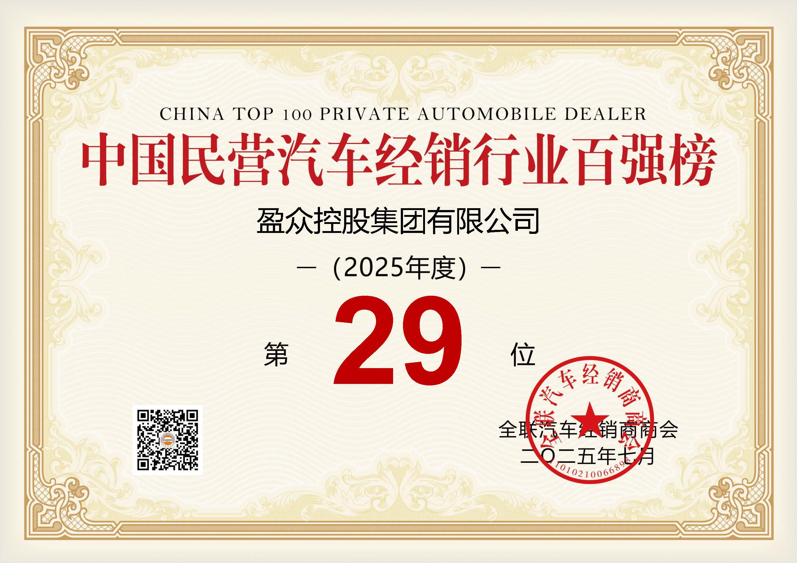 喜報 | 盈眾控股集團榮登“2025中國民營汽車流通行業(yè)百強榜”第29位!